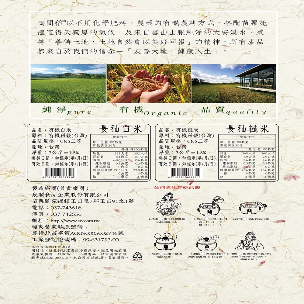 《禾掌屋》鴨間稻 —有機長秈糙米3kg/包 | 福報購蔬食購物商城