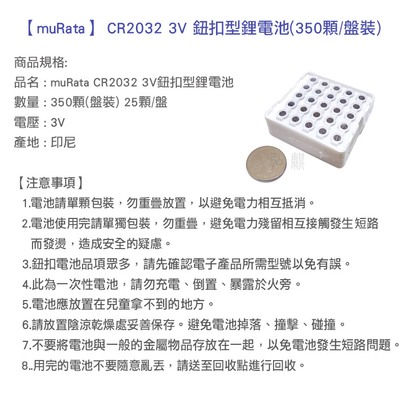 《弘麒》muRata CR2032 3V鈕扣型鋰電池 (350顆;盤裝)